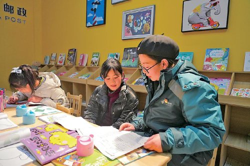 在“愛(ài)心書(shū)屋”,郵政工作人員陪伴孩子們度過(guò)充實(shí)、溫馨的寒假時(shí)光。 □冉七龍 攝