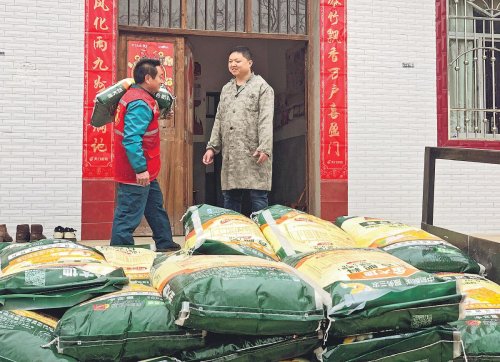 湖北省天門市郵政分公司黨委積極服務“三農”發展,助力鄉村振興,成立黨員志愿服務隊為丘陵地區的果農配送肥料,助推特色產業發展。圖為近日李場郵政支局黨員黃祥忠用手扶拖拉機將肥料配送到果農家中。