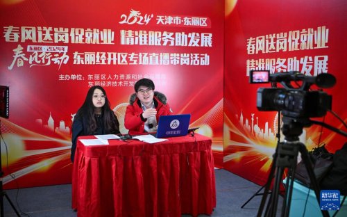 2024年2月29日,主播在天津市東麗區一場招聘會上進行直播帶崗。新華社記者 孫凡越 攝