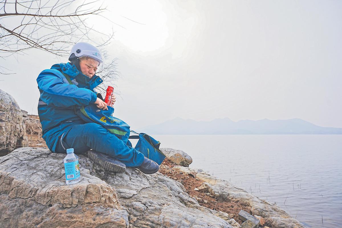 在等待渡船時(shí),石新國(guó)吃點(diǎn)干糧、喝點(diǎn)水。 李平 攝