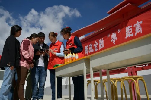 村委會中心迎風招展的五星紅旗下,綠色的郵車即將完成郵件交接,而鮮紅的“郵政金融‘零’距離,鄉村振興‘郵’力量”橫幅旁,辦理業務的村民仍絡繹不絕。