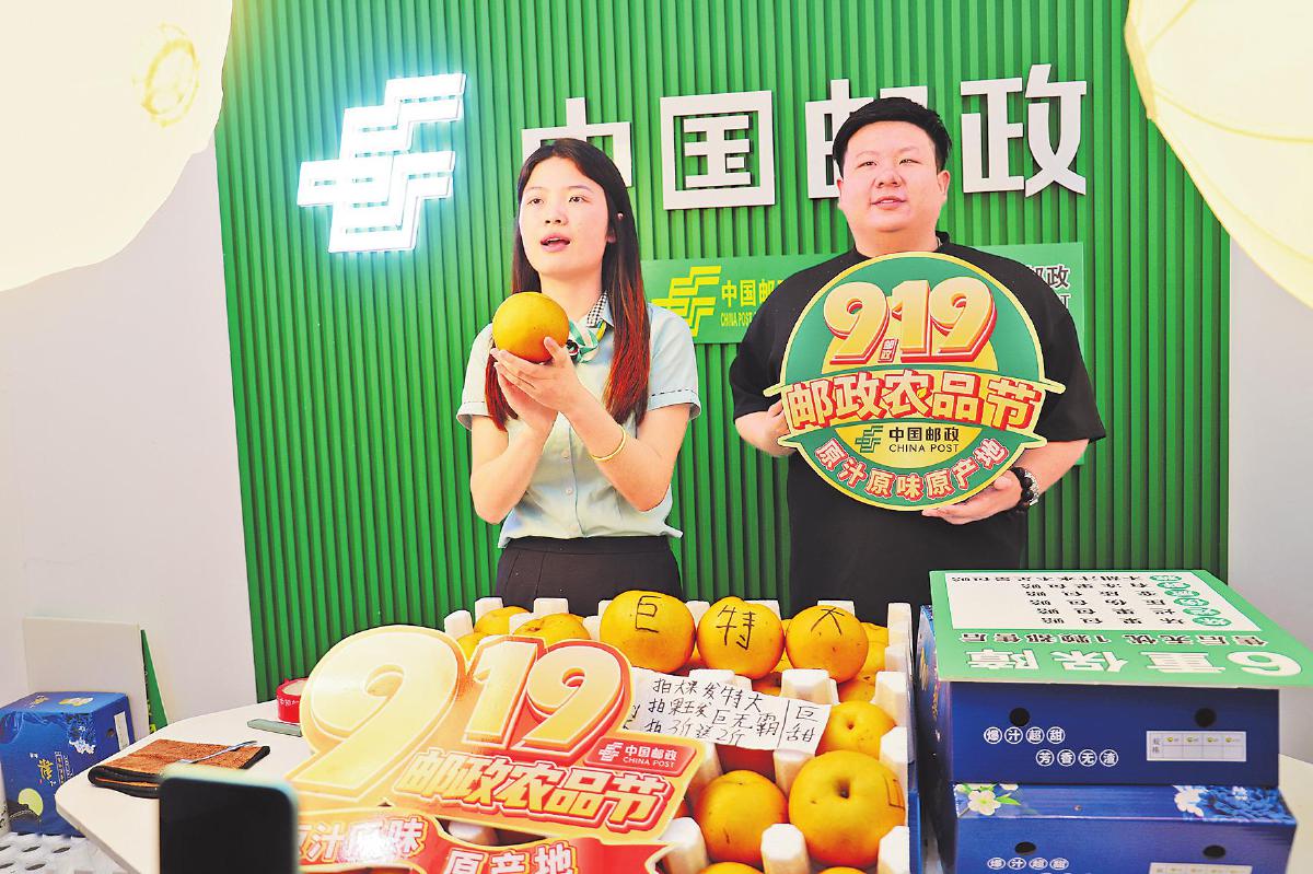 秋月梨成為老河口郵政電商直播的“主角”?!趼櫺棱z