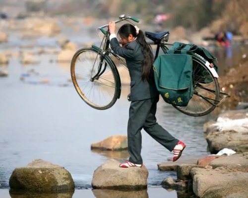 2007年1月,郵遞員羅細英從陳坊鄉出發前往鎖子橋村(自然村)送信件和報刊,為了趕時間、抄近路,就扛著自行車過河。跟隨采訪的新華社記者在河邊拍下了這張照片。如今,老照片拍攝地的小河溝上已建起了公路橋。