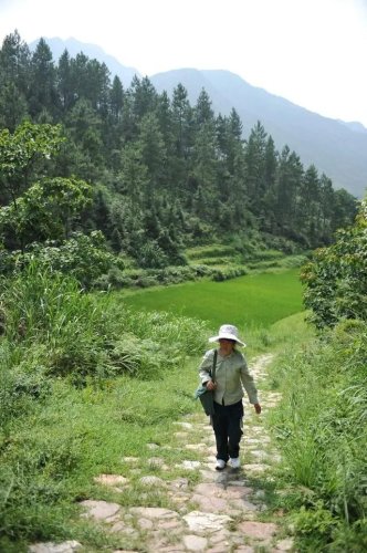這是在江西省鉛山縣陳坊鄉,羅細英在步行送郵件的路上(2011年7月20日攝)。新華社記者 周密 攝
