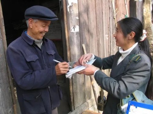 這是在江西省鉛山縣陳坊鄉,羅細英把信件送到居民手中(2007年1月6日攝)。新華社記者 陳春園 攝