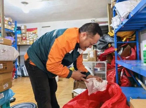 攬投工作人員羅全投遞包裹到驛站。魏容攝