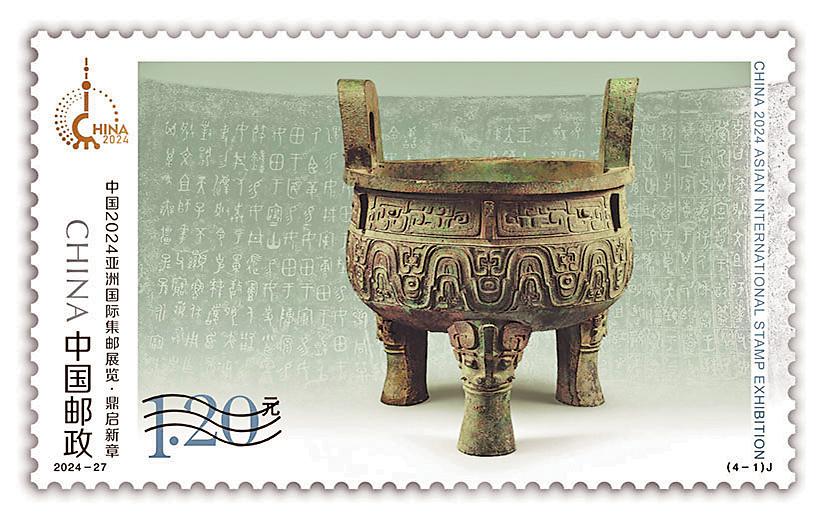 我負責設計這套紀念郵票第1枚“鼎啟新章”。選擇大克鼎為畫面主要元素有三方面原因。第一,鼎是中華民族傳統文化中最高等級的禮器。以大克鼎為郵票畫面主要元素,寓意中國人民以最高等級的禮儀歡迎來自全球的集郵愛好者來到上海共襄盛會。第二,大克鼎是上海博物館鎮館之寶。使用郵展舉辦地具有地域文化特色的文物作為郵票元素,是郵展題材郵票設計的一種傳統,我在這次設計中延續了這種傳統。第三,我在設計過程中發現,大克鼎中心的花紋和繁體“亞”字非常神似。文物與郵票主題相呼應,在我看來,也是一種“天作之合”。