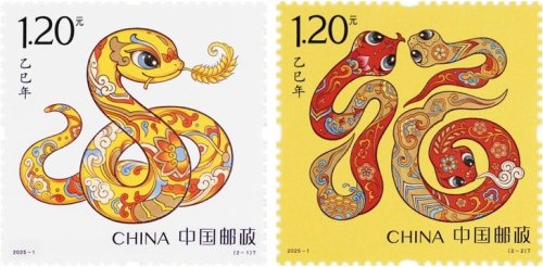 《乙巳年》特種郵票一套2枚,郵票圖案名稱分別為蛇呈豐稔、福納百祥。該套郵票以敦煌壁畫和傳統(tǒng)民俗為靈感來源,將蛇的形象與吉祥寓意巧妙結(jié)合,既體現(xiàn)了生肖文化的獨特魅力,又凝聚了樸素靈活的民間智慧。兩枚郵票不僅是對生肖之美的再次詮釋,更是對時和歲豐、福澤四季的深情祝福。郵票第一圖“蛇呈豐稔”,畫面提煉了中華傳統(tǒng)文化中盤蛇的靈動意象,加以喜慶裝飾應(yīng)和年節(jié)氛圍。金色的蛇軀蜿蜒,口中銜著一束“嘉禾”,象征著“倉廩實,衣食足”的美好圖景。蛇身金光熠熠,與璀璨的麥穗交相輝映,仿佛繪就了一幅豐收時節(jié)金光燦爛、富饒滿溢的畫卷,寓意著風調(diào)雨順之年、五谷豐登之景,以及國泰民安的盛世祥和。郵票第二圖“福納百祥”,畫面以草書筆意將三條蛇創(chuàng)意性地構(gòu)成了“福”的字形,簡練灑脫、柔美順通。兩大一小三條蛇之間情感細膩流動,顧盼生情,生動展現(xiàn)了闔家歡樂的溫馨場景,寓意著和合共生、福滿人間,寄托了人們對美好生活的無限追求與誠摯祈愿。該套郵票由北京郵票廠有限公司采用膠雕套印工藝印制,全套郵票面值為2.40元,計劃發(fā)行套票2680萬套、版式二162萬版、小本票387萬本。