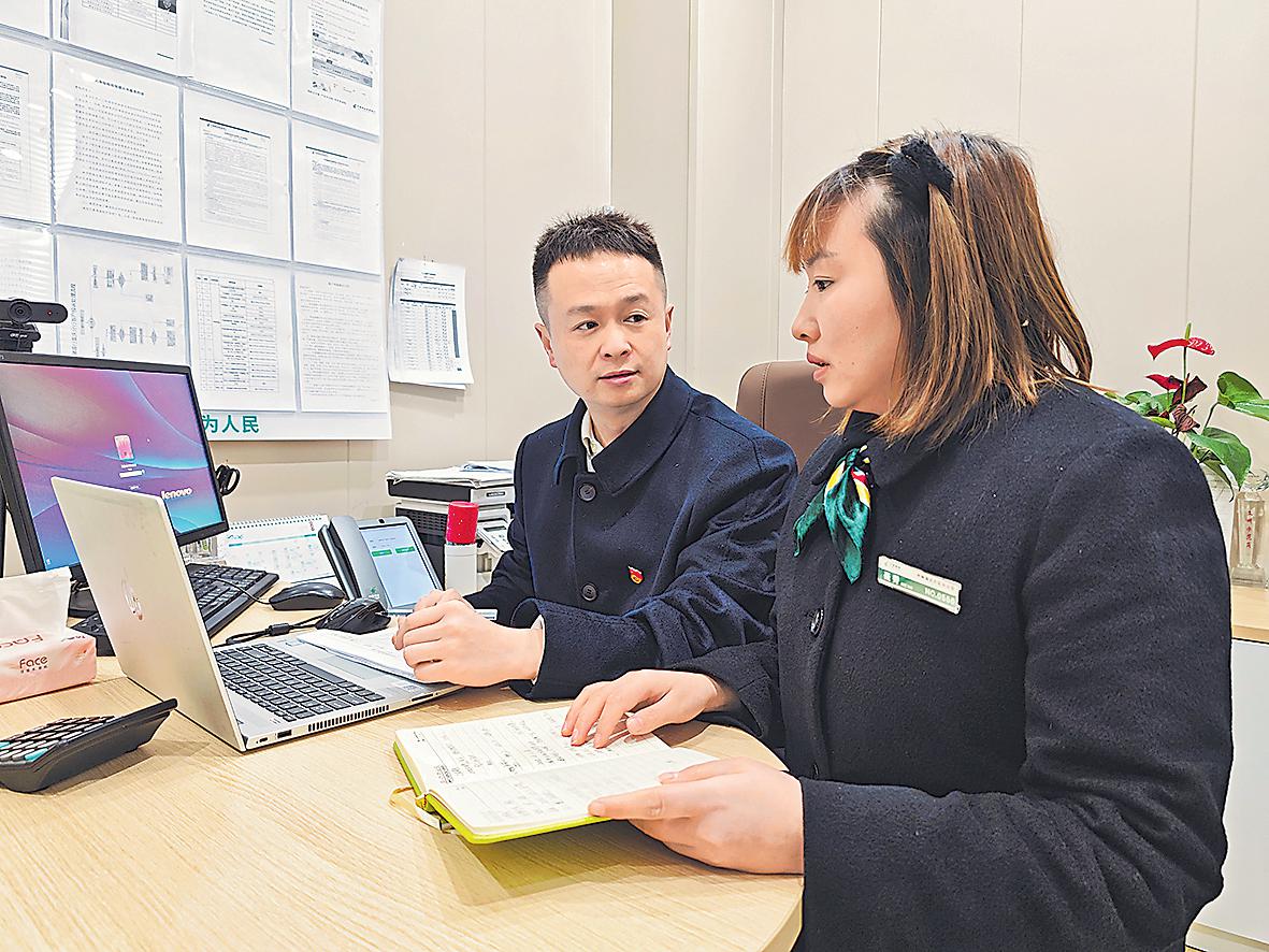 蔣源(左)指導理財經(jīng)理為客戶制定理財方案。□胡陵 攝