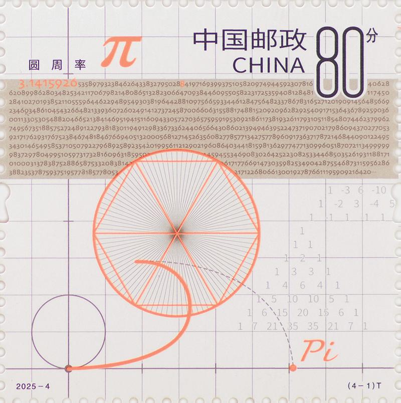該套郵票設(shè)計(jì)語(yǔ)言現(xiàn)代,使人眼前一亮。第一枚“圓周率”作為廣為人知的數(shù)學(xué)常數(shù),貫穿于幾何、物理等眾多學(xué)科。郵票元素包含了π的本質(zhì)定義,以極細(xì)線表現(xiàn)早期經(jīng)典割圓法,并將圓周率小數(shù)點(diǎn)后996位以縮微文字的方式呈現(xiàn)于畫面,特別通過(guò)橘色設(shè)計(jì)突出前7位,為的是紀(jì)念我國(guó)南北朝時(shí)期數(shù)學(xué)家祖沖之。第二枚“勾股定理”是中國(guó)古代幾何學(xué)的成就之一。它給出了直角三角形三邊的長(zhǎng)度關(guān)系,即任意一個(gè)直角三角形的兩條直角邊長(zhǎng)度平方之和等于斜邊長(zhǎng)度的平方。郵票在局部采用燙印工藝,以分層的視覺(jué)形式展現(xiàn)了證明過(guò)程。第三枚“歐拉公式”被譽(yù)為“數(shù)學(xué)中最美的公式之一”,郵票以圖形的方式表現(xiàn)了歐拉公式將數(shù)學(xué)中5個(gè)重要常數(shù)(e、i、π、1、0)聯(lián)系起來(lái)。歐拉之眼圖案部分采用縮微工藝,將這5個(gè)常數(shù)與防偽技術(shù)相結(jié)合。第四枚“莫比烏斯帶”作為一種神奇的拓?fù)鋱D形,只有一個(gè)面和一條邊界。郵票采用局部燙印工藝,豐富的色彩變幻更好地呈現(xiàn)莫比烏斯帶的多維性質(zhì)。在紫外光照射下,螞蟻的足跡和畫面下方的銀河相呼應(yīng),寓意著從微觀逐步擴(kuò)展到更廣闊的宏觀領(lǐng)域。