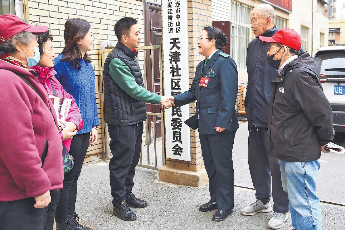全國人大代表、遼寧省大連市中山區郵政分公司寄遞事業部勝利橋普郵營業部站長趙明枝第一時間來到社區進行走訪,并向居民宣講全國兩會精神,與大家分享參會體會。 □亢俊杰 劉曉明 攝