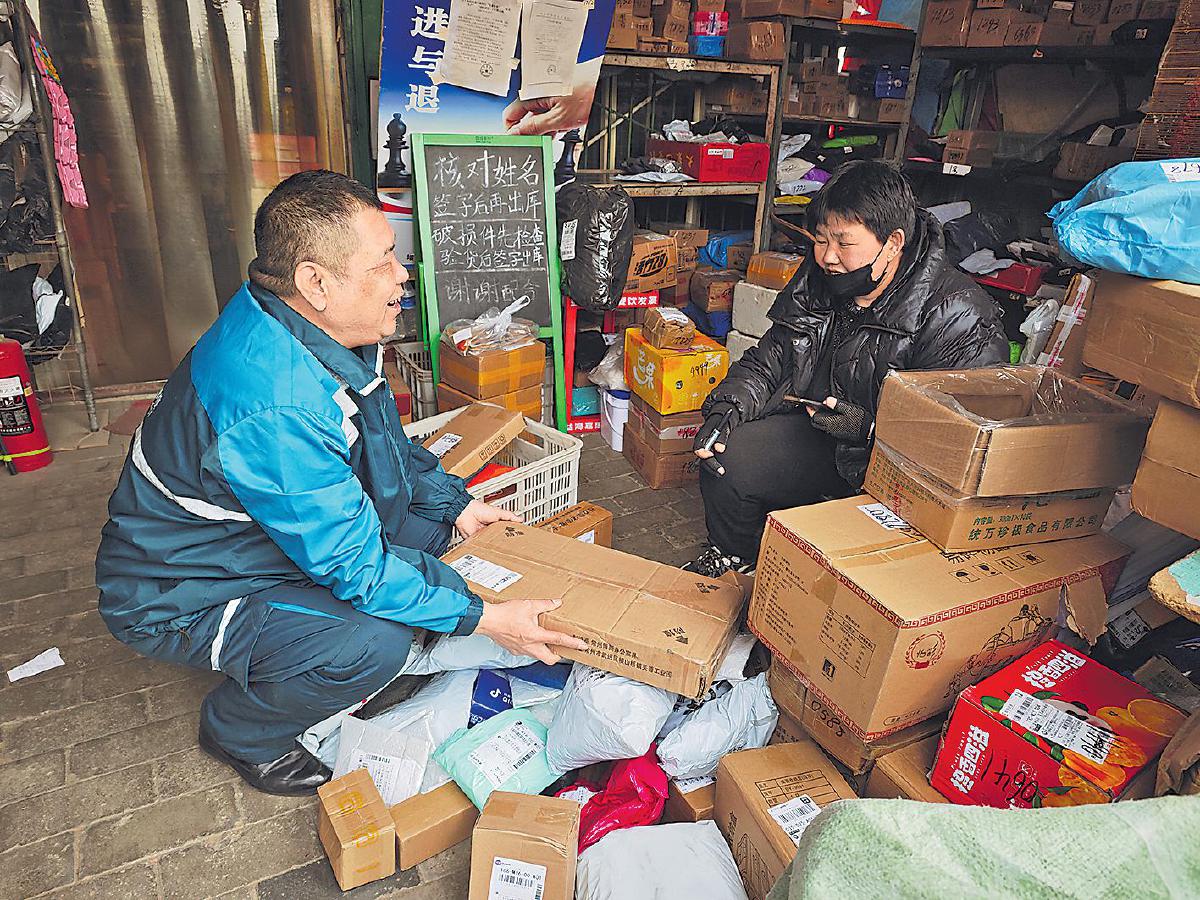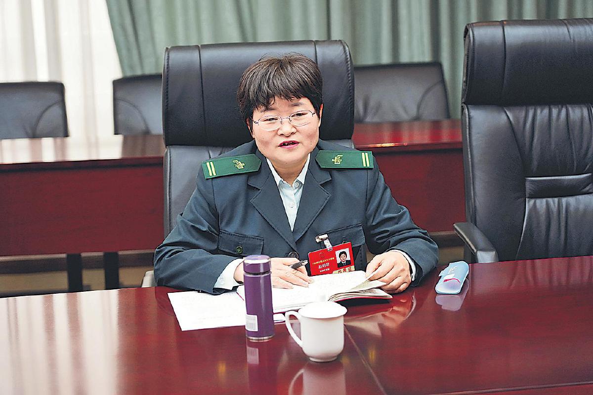 全國人大代表、河北省邢臺市郵政分公司城區寄遞事業部鄉郵員郭紅崗向投遞道段上的客戶講述全國兩會的盛況,傳遞黨的聲音。 □程鈺 孫延兵 攝