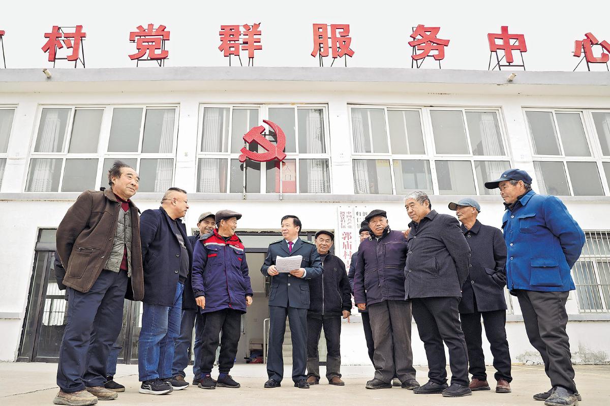 全國人大代表、江蘇省宿遷市泗洪縣郵政分公司歸仁支局局長殷勇向當地群眾宣講全國兩會精神。 □柏濱豐 張成 攝