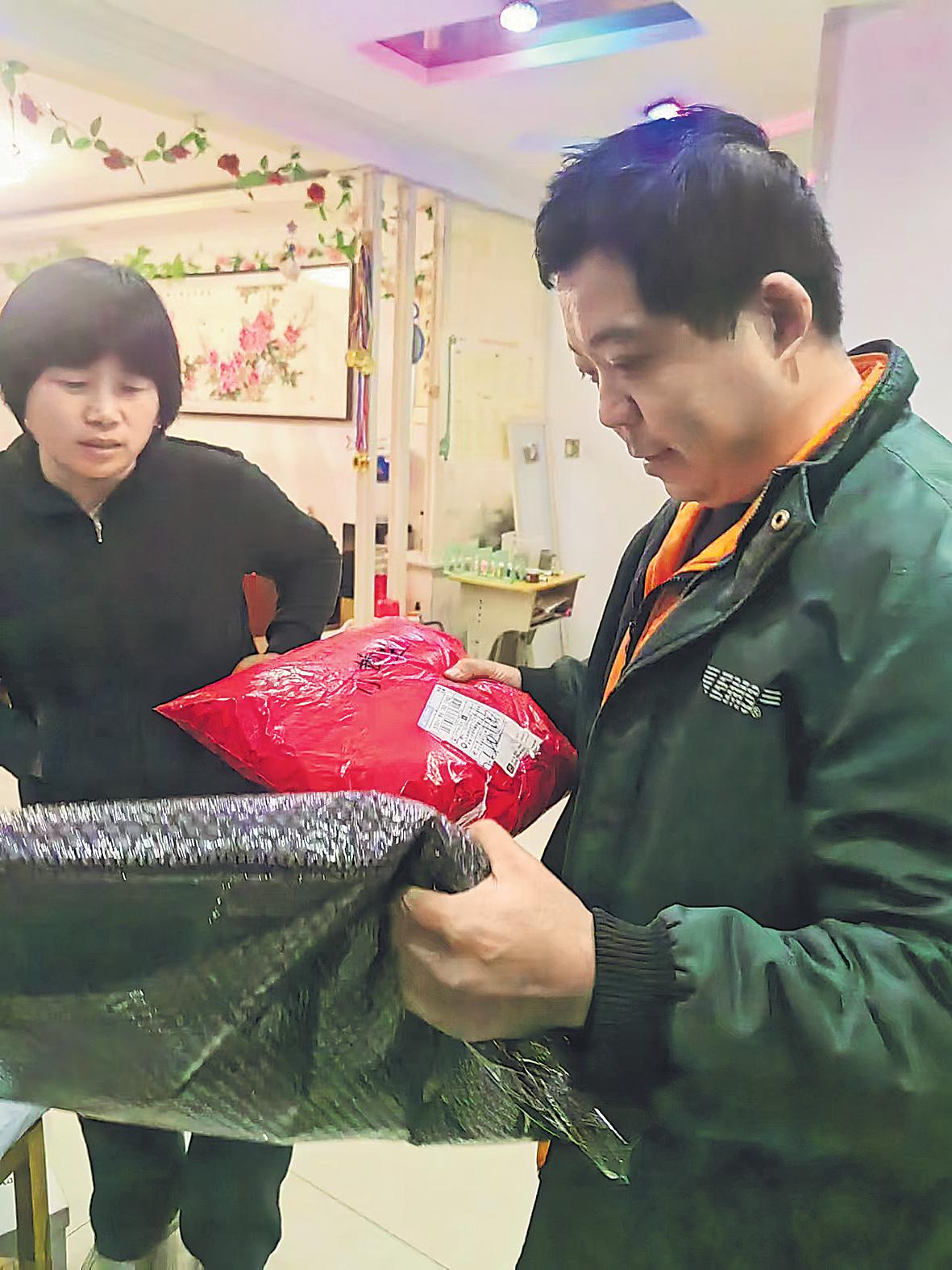 相靜雪(右)給客戶送郵件。
