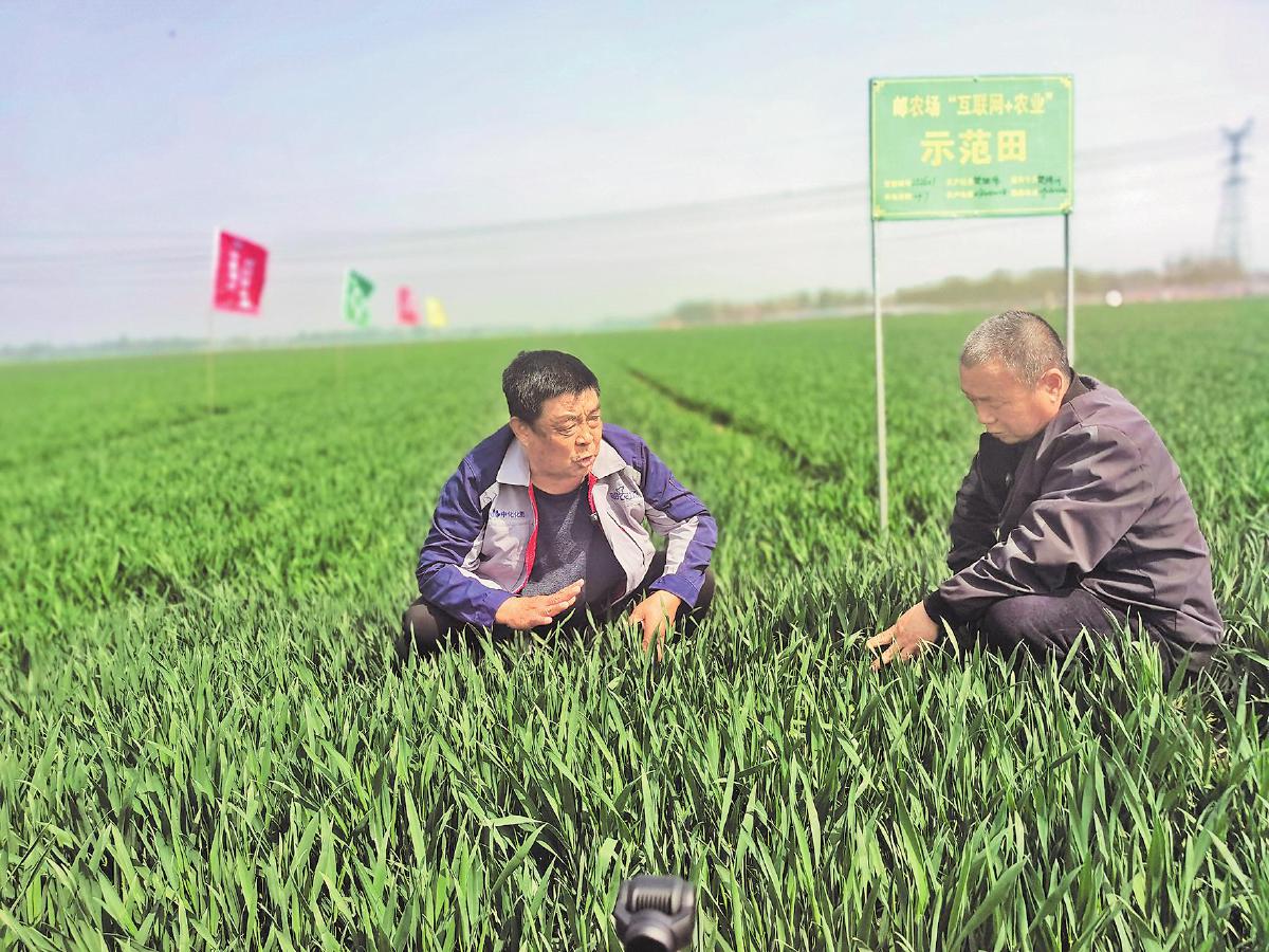 “郵農(nóng)場”服務(wù)專員樊瑞河(左)在田間巡查,指導村民做好春小麥的管理。