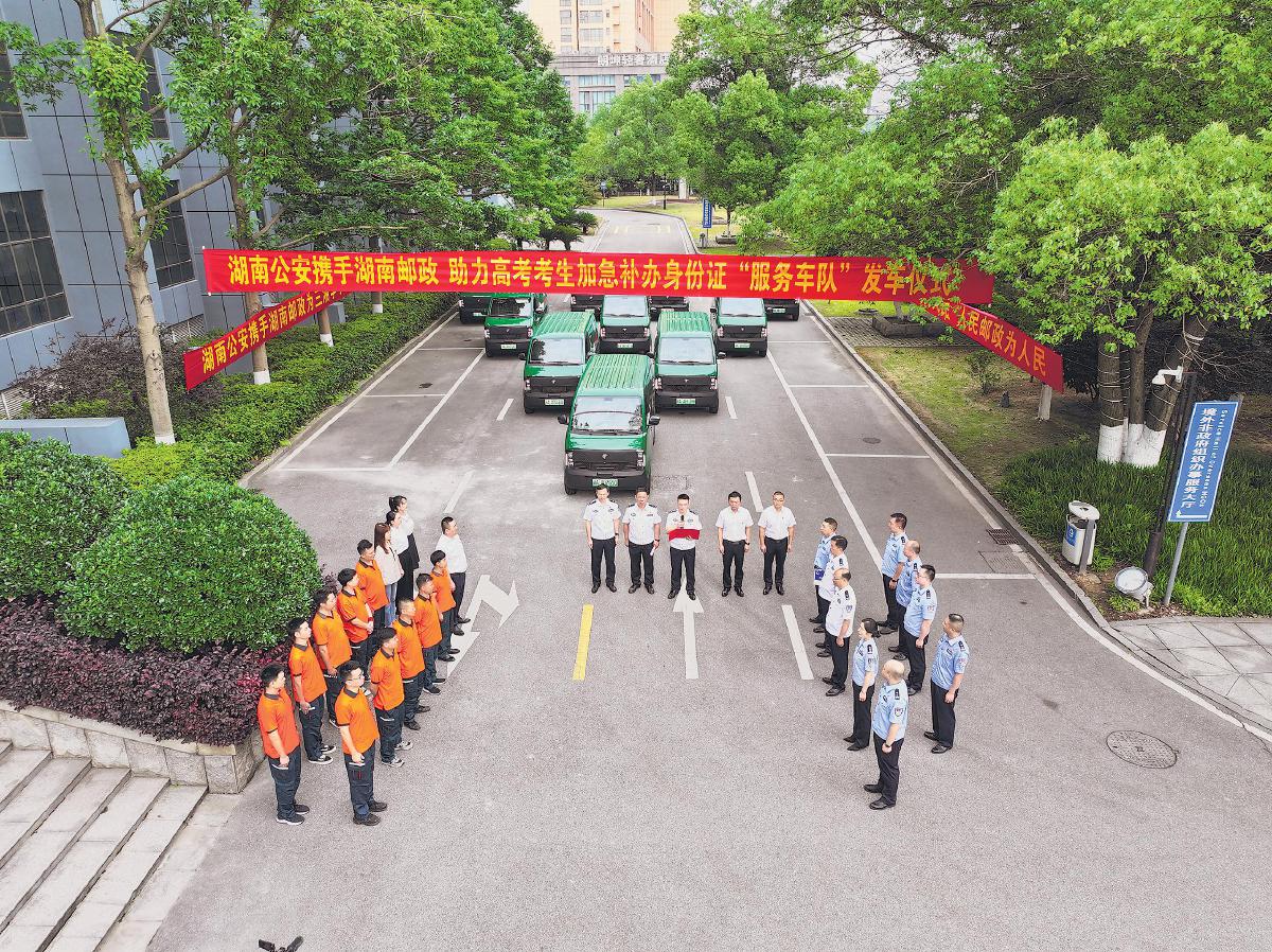 6月5日上午,湖南省公安廳、湖南省郵政分公司在省公民信息管理局?jǐn)y手舉行高考考生身份證加急補(bǔ)辦“服務(wù)車隊(duì)”發(fā)車儀式。這是湖南警郵連續(xù)第七年為中高考考生開通身份證補(bǔ)辦加急“綠色通道”。
