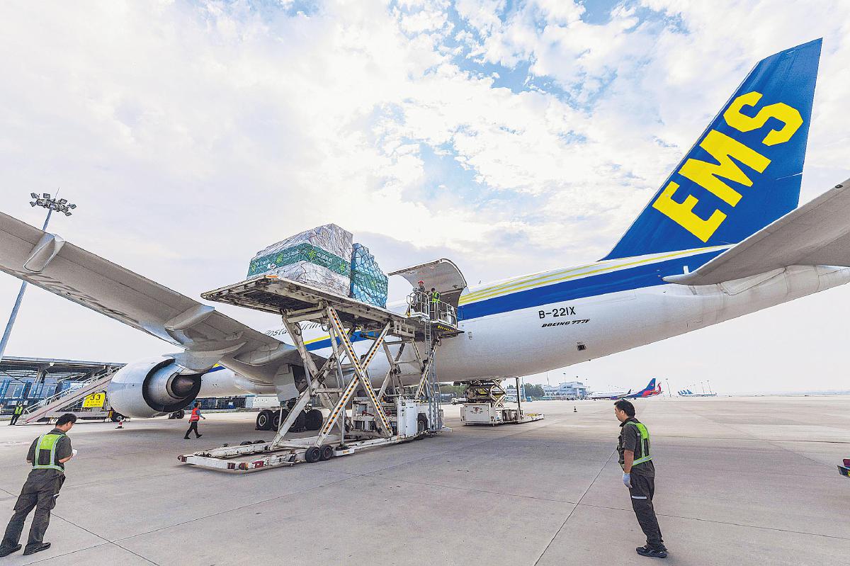 “鄭州—盧森堡”航線首班承運(yùn)航班CF257在裝載貨物。 □張晨昱 攝