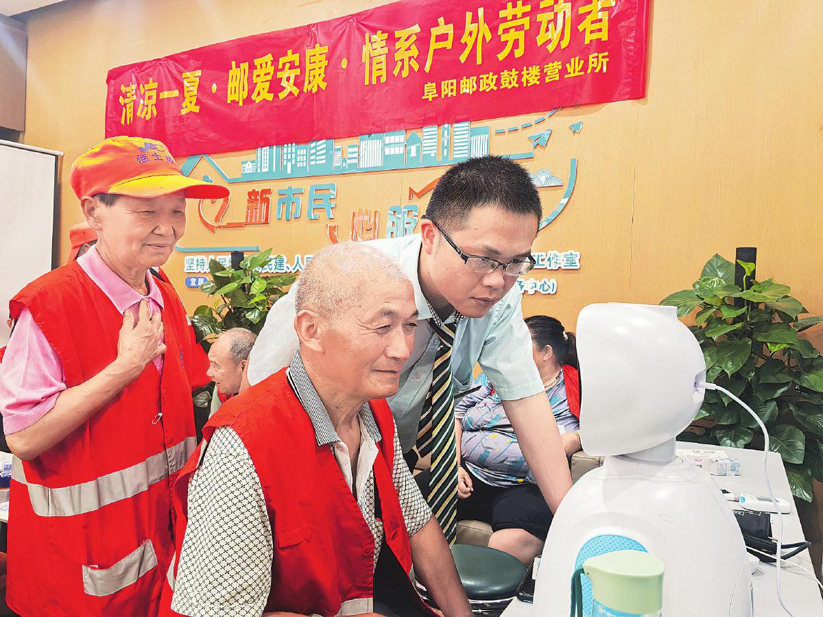 據(jù)了解,進(jìn)入夏季以來,阜陽市郵政分公司37處“郵愛驛站”全部開啟“清涼模式”,為環(huán)衛(wèi)工、快遞員、外賣配送員、出租車駕駛員等戶外勞動(dòng)者提供歇腳、喝水、納涼等一攬子貼心服務(wù)。圖為郵政工作人員幫助環(huán)衛(wèi)工人利用智能視頻醫(yī)生系統(tǒng)在線連接知名醫(yī)院的專家進(jìn)行問診。
