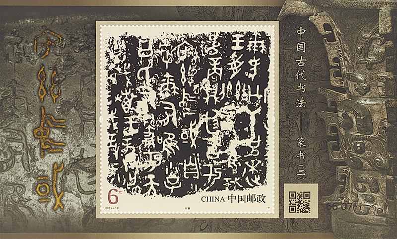 6月21日,《中國古代書法——篆書(二)》特種郵票將發(fā)行。該套郵票一套4枚,小型張1枚。郵票圖案名稱為“大盂鼎”“中山王舋鐵足鼎”“石鼓·吾車刻石”“瑯琊刻石”,小型張圖案名稱為“何尊”。