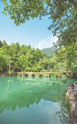 正午的陽光灑向荔波小七孔橋畔,藍(lán)綠色的湖水靜若綠寶石,七孔古橋如弦月橫臥碧波之上,橋孔與倒影相映成環(huán)。嶄新的旅游大巴載著來自廣東、江蘇等地的游客駛?cè)脒@片山水,感嘆聲與快門聲立即響成一片。