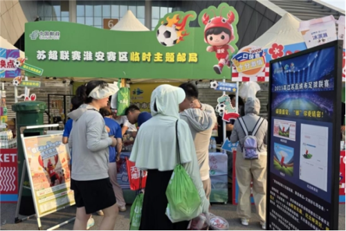 鎖定主場,延伸服務半徑。淮安郵政充分發(fā)揮主場優(yōu)勢,成功爭取多個現場助威名額,在全市范圍內策劃開展“郵我來助威,一鉗定勝負”系列主題活動。在郵政網點設立“蘇超助威區(qū)”,為市民提供賽事直播觀看、文創(chuàng)產品領取等沉浸式互動體驗,有效延伸了服務觸角。
