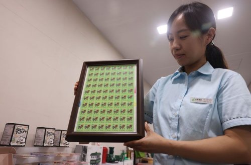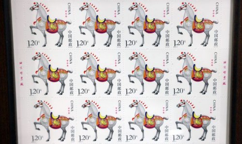 工作人員展示1990年馬年生肖郵票。