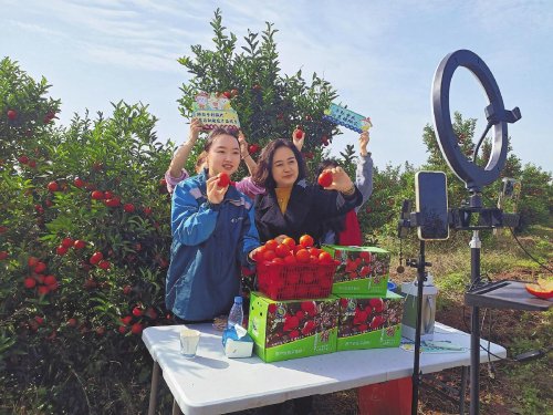 銅梁郵政主播與村干部聯手在柑橘園內開展助農直播。 □楊洋 攝