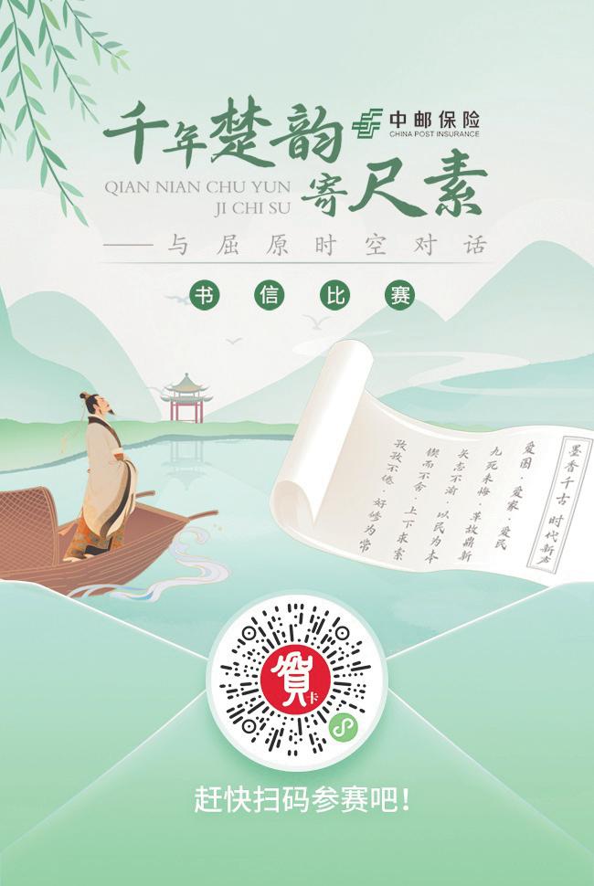 一紙方寸,千年楚魂。在《楚辭》特種郵票確定于5月31日首發后,湖北省郵政分公司提出以書信比賽為郵票發行引流造勢、同步推動函件業務發展的設想。5月11日,由中郵保險冠名的“千年楚韻寄尺素——與屈原時空對話”書信比賽橫空出世。此次比賽最大的亮點是參賽作品通過“寄賀卡”小程序線上征集,這也是中國郵政首次利用線上小程序開展的書信比賽活動。