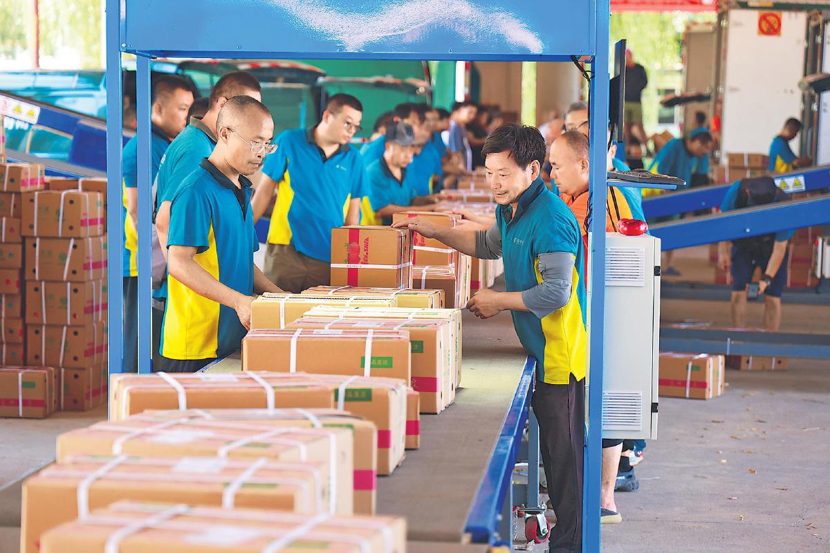 在大華山鎮(zhèn)攬收點,桃農(nóng)李大姐的鮮桃剛剛褪去專用紙袋過秤稱重,面單信息便通過PDA實時錄入系統(tǒng),隨即鮮桃被裝入印有“郵政農(nóng)品”標(biāo)志的定制快遞箱,開啟了郵寄旅程。“我們負責(zé)這片區(qū)域的10個村,郵件在站點完成前置分揀,按同城、外省分類,8點半前裝車直發(fā)本區(qū)處理中心,不再繞道市里中轉(zhuǎn)。”閆雷解釋道。這種“收寄—前置分揀—直達本區(qū)”的直封直發(fā)模式,是今年提速的關(guān)鍵。各區(qū)團隊每天6點前到崗,確保8點至8點半的“同城當(dāng)日遞”首頻次郵件準(zhǔn)時發(fā)出。