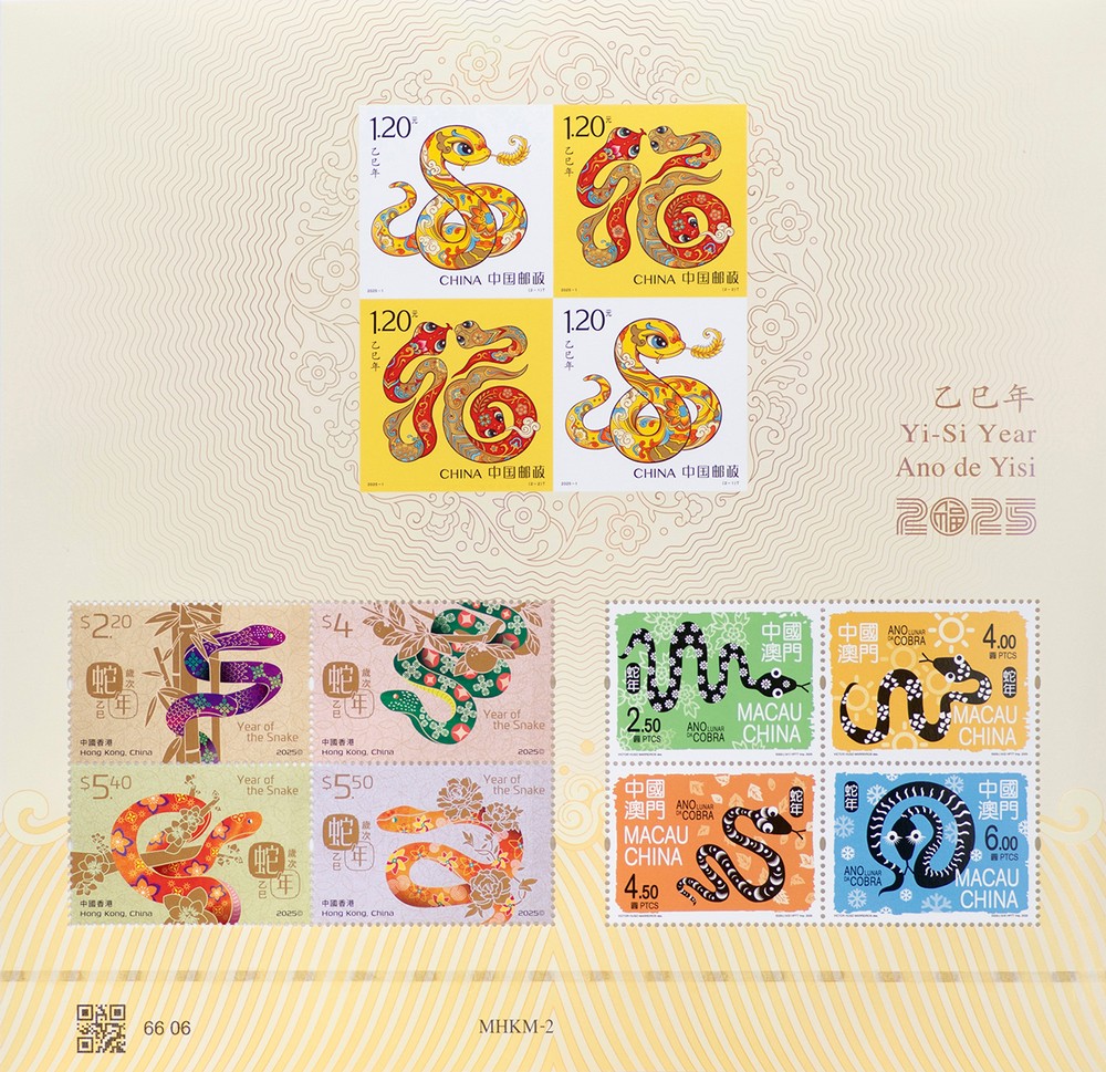 另與香港郵政、澳門郵電共同印制同題材三地小全張1枚,內含中國郵政郵票4枚(2套,無齒孔),香港郵政、澳門郵電郵票各4枚。小全張編號:MHKM-2。成品規格:206×200毫米。版別:膠雕套印。印制廠:河南省郵電科技有限公司。郵折售價:人民幣52元。計劃發行數量:40.5萬枚(不含港澳地區)。