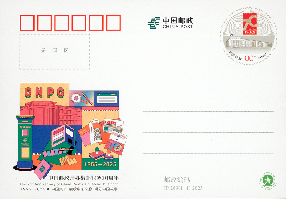 中國郵政定于2025年1月10日發行《中國郵政開辦集郵業務70周年》紀念郵資明信片1套1枚。詳情如下: