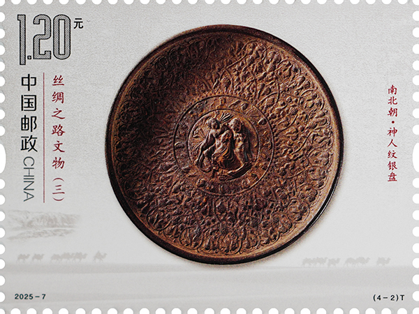 神人紋銀盤出土于甘肅省靖遠(yuǎn)縣北灘,藏于甘肅省博物館,是中國絲綢之路上發(fā)現(xiàn)的重要羅馬文物,據(jù)考證于公元四到五世紀(jì)傳入中國。盤內(nèi)壁滿飾浮雕花紋,分三圈列置。外圈飾勾連的葡萄卷草紋,其間棲有小鳥、蜜蜂等小動物。中間一圈浮雕為古希臘奧林匹斯十二神的頭像,每個頭像左側(cè)各有一只動物。中心為一高浮雕男性倚一花豹而坐。郵票采用啞沙和三維浮雕起凸工藝的融合應(yīng)用,呈現(xiàn)銀盤的細(xì)節(jié)特征和質(zhì)地紋理。此件器物發(fā)現(xiàn)于絲綢之路甘肅段的黃河渡口,是研究東西方經(jīng)濟(jì)文化交流交往的重要實物資料,也是十分罕見的絲綢之路遺珍。