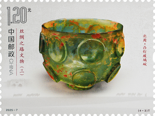 凸釘玻璃碗出土于寧夏固原市南郊的北周李賢夫婦合葬墓,現(xiàn)藏于寧夏回族自治區(qū)固原博物館。該碗為直口,矮圈足,通體透明,呈碧綠色,外壁飾以14個凸起的圓形裝飾兩周,上下錯位排列。其內(nèi)壁光潔,外壁有薄層的金黃色分化物,其材質(zhì)屬鈣鈉玻璃,含有較多其它礦物質(zhì),該形制在薩珊時期的伊朗高原十分流行。郵票將特種光油和三維浮雕起凸組合應(yīng)用,玻璃碗晶瑩剔透的質(zhì)感和立體感躍然紙上。固原作為絲綢之路西北咽喉門戶,見證了東西方文化交流交融,提供了考察當(dāng)時東西方貿(mào)易極為重要的資料。