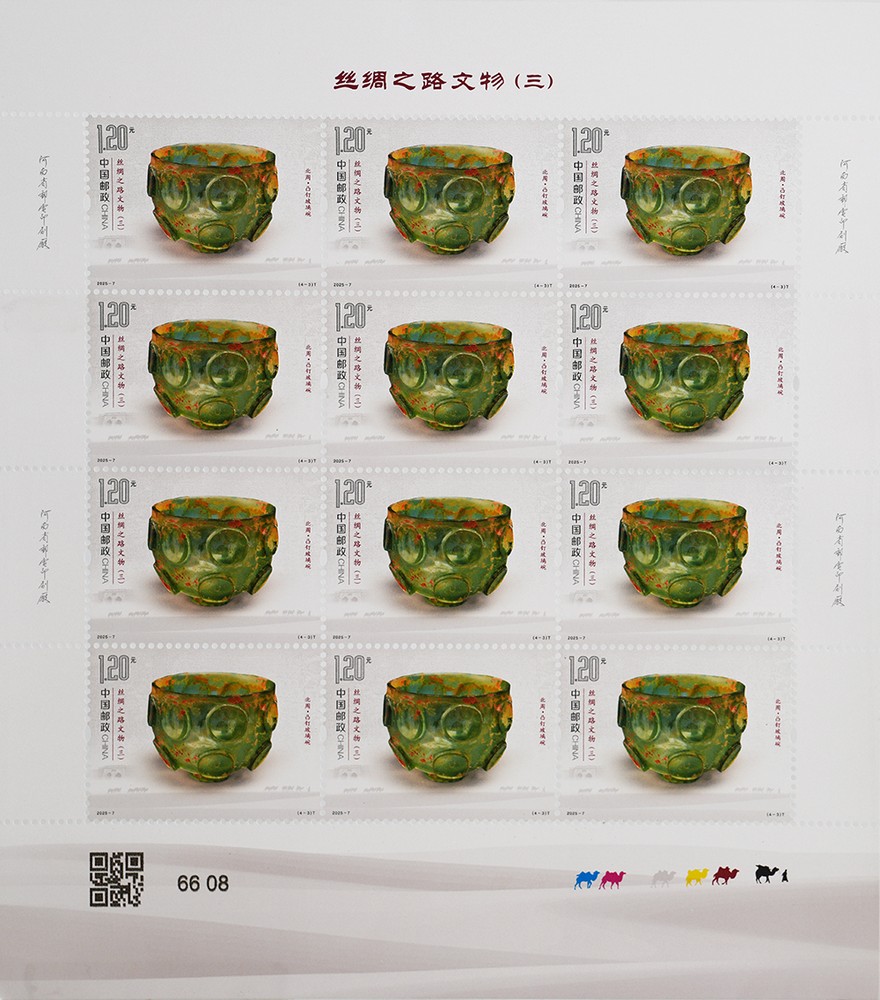 中國郵政定于2025年5月18日發(fā)行《絲綢之路文物(三)》特種郵票1套4枚,郵票圖案名稱為:漢·“五星出東方利中國”錦護(hù)膊、南北朝·神人紋銀盤、北周·凸釘玻璃碗、唐·胡人牽駝載絲壁畫。全套郵票面值4.80元,計劃發(fā)行數(shù)量590萬套。