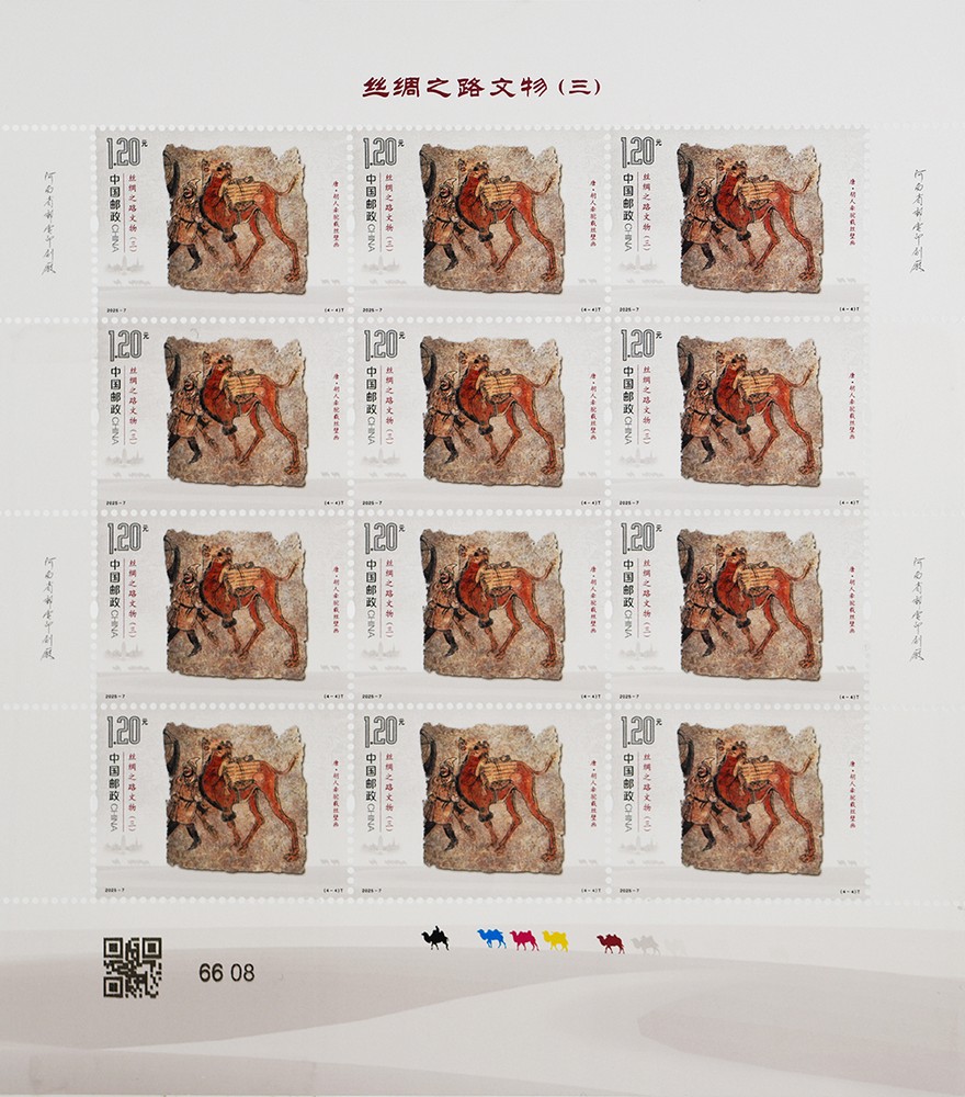 胡人牽駝載絲壁畫出土于河南省洛陽市安國相王孺人唐氏墓,現(xiàn)藏于洛陽古墓博物館。壁畫繪制在唐氏墓墓道西壁,正中一匹高大雄健的駱駝昂首挺胸、抬蹄甩尾、闊步前進(jìn)。駱駝背上,是捆扎好的絲綢卷和瓶子。前面牽韁繩的西域人高鼻梁、絡(luò)腮胡,頭戴尖帽,身著翻領(lǐng)長衫,腳蹬黑色高靿靴,正邁步牽駝前行。該壁畫生動再現(xiàn)了各國商人來到絲綢之路的東方起點之一洛陽,裝載絲綢西行走上絲綢之路的場景,客觀地反映了唐代的社會場景和世俗風(fēng)情,講述著文明交流互鑒的故事。郵票結(jié)合逆向上光和啞沙工藝,既展現(xiàn)出壁畫滄桑的歷史變遷,又突出壁畫中人物、飾物、動物等不同的色彩效果,賦予其獨(dú)特的藝術(shù)氣質(zhì)。